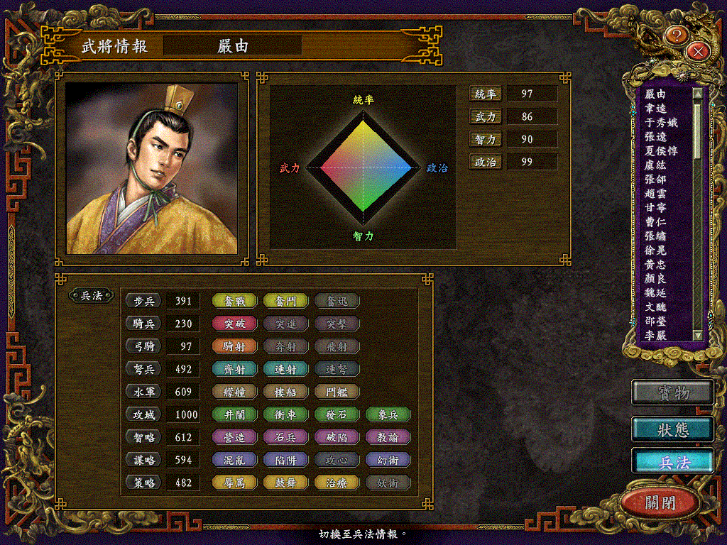 智力和政治的资质是卓著,统帅和武力资质只是普通
