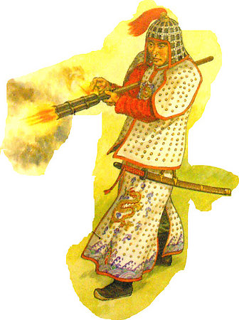 然而這都是消極的防禦手段;要有力的挫敗敵人,還需要更積極的手段。在整個明代,達成這個手段的方式也就是訴諸火器的運用──明代很早就發展出了輪番發射火器的戰術。「蓋鎗率數層排列,前層既發,退居次層之後。…前十一人放鎗,中十一人轉鎗,後十一人裝藥。隔一人放一鎗,先放六鎗,餘五鎗備敵進退。前放者即轉空鎗於中,中轉飽鎗於前,轉空鎗於後裝藥,更迭而放,次第而轉,…如此則鎗不絕聲,對無堅陣。」[註14]此雖為明英宗時代的紀錄,然而原文又有「臣訪求 太宗皇帝舊制」字樣,則可知這種戰術的運用或許可上溯至明成祖時期。
