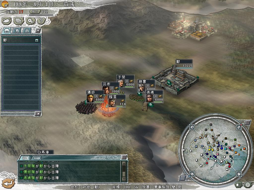 到我军物资抵达江都港,已过了整整3个月。吕布率主力将领也同时到达[下邳到江都港只需10日],立刻全员剑兵分4队对长江对面,4000人的无人空港曲阿港进军。每队带100日粮足够,留魏续运送其余物资随其后。这里我冒了点险,为了在下邳收取更多金钱,没有派水军A的鲁肃随军,导致4队人仅水军B的貂禅一队可用火箭,所以把她配给了兵最多武力最高的吕布。到198年7月1日,才攻陷曲阿港。此时曹军已攻落空城小沛,且已从陈留濮阳出兵继续攻下邳。这之前袁绍亦派高览7000人试图远袭小沛,一度抵达下邳附近。但我军有大智勇,直接无视他,果不出所料,待曹军一落城,这队袁军就折了回去。