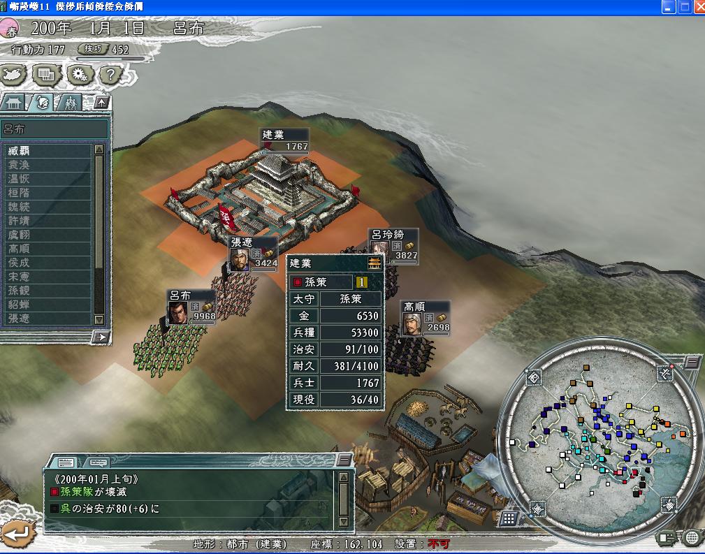这样就确定了最佳的侵攻目标,三城之孙策,其总兵力与我军相当,其后方吴郡仅8000人,会稽仅4000人,主力侵攻目标为袁术,对我军并不重视。真正能对我方造成威胁的名将很少。周瑜的[火神]是AI最不能完全发挥的强力特技之一,特别是在初期,其威摄远不能与AI曹操的[虚实]相比,并吞之难度并非太大。江东人材质量可与曹操相比,寿命也很可观。夺取江南后更可只守西北一面,安心发展增进国力。