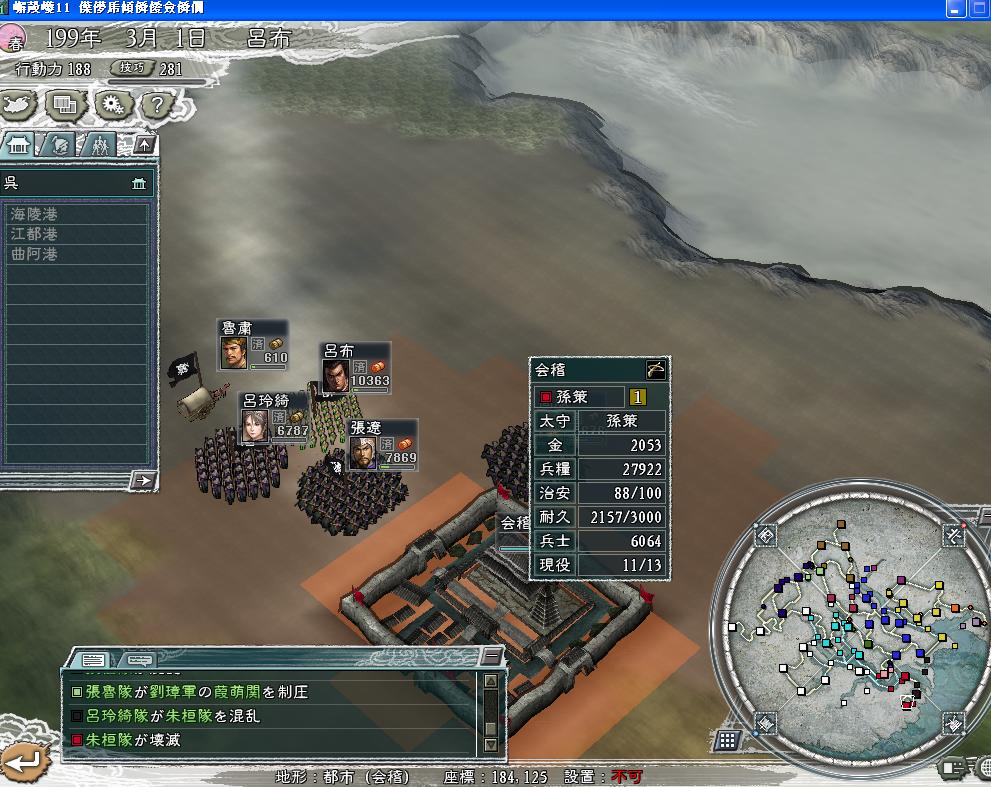 这样就确定了最佳的侵攻目标,三城之孙策,其总兵力与我军相当,其后方吴郡仅8000人,会稽仅4000人,主力侵攻目标为袁术,对我军并不重视。真正能对我方造成威胁的名将很少。周瑜的[火神]是AI最不能完全发挥的强力特技之一,特别是在初期,其威摄远不能与AI曹操的[虚实]相比,并吞之难度并非太大。江东人材质量可与曹操相比,寿命也很可观。夺取江南后更可只守西北一面,安心发展增进国力。