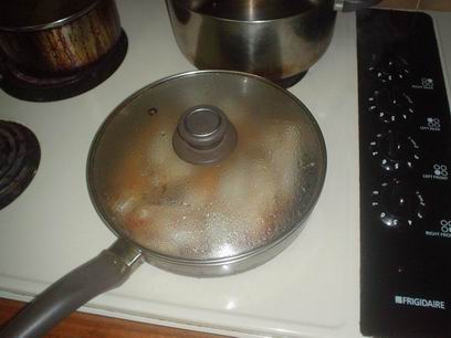 4.锅内放一匙黄油,等差不多融化时,放入蒜泥和香菇丁,炒一会儿.(可以放心,不怎么溅油..至少我余的时候是这样的..要不余也不敢炒..余最怕身上沾油了...)