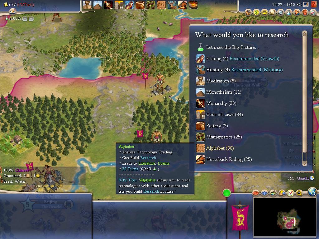科技方面,按惯例是青铜优先的,不过看看这副图,食物实在是短缺,自然成长的话恐怕得NN年后才能利用上大理石,权衡再三,还是首发动物驯养了: