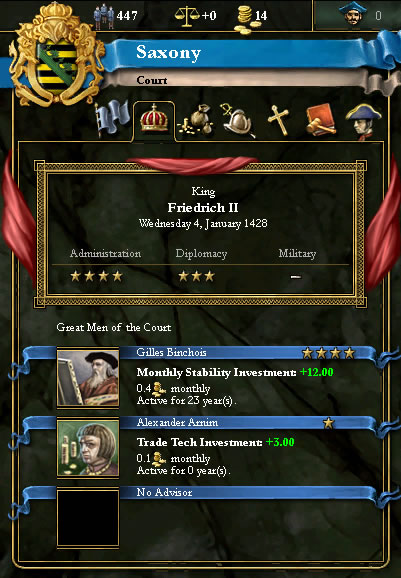 (宫廷面板——现任统治者为腓特烈二世:行政能力7,外交能力6,军事能力3