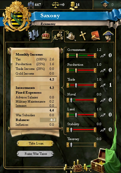 (军事面板——萨克森陆军现有1k西欧中世纪步兵,1k西欧骑士,军事维持费0.2金/月,平时将维持费水平调最低,开战时再调满)