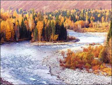 童话般的喀纳斯,这里有成片的桦树林覆盖在山的南麓。喀纳斯河与禾木河的河水都来自额尔齐斯河。喀纳斯河与禾木河形成一个半圆,分别绕着阿勒泰山流向俄罗斯与蒙古。这儿山青水秀,皑皑的白雪在阿勒泰山顶静静地覆盖着。由于人烟稀少,这儿的植被保存得十分完好。眼下正值秋季,也是这里一年一度的“色彩大展演”的时分,满山的桦树叶黄了、枫树叶红了,秋风中,整座山都在抖动,一片金黄。走进这童话般的世界中,走路都会十分小心,生怕踩折了嫩枝,踏伤了小草,破坏了大自然的宁静与无暇。