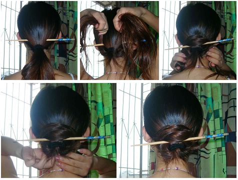 2.分开两股头发 向上围着簪子交错环绕.