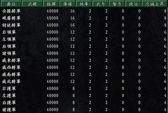 猛将这么多却不能分配到一个将军位 感觉对不起这些历史名将啊  所以我对爵位做了下修改...希望广翔公在今后的版本中能考虑到这个问题...下面是鄙人自己乱改的 -.- 喜欢的朋友可以试试
