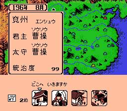 记得第一次打的时候,看着攻略,对着电视荧屏上的日语一条一条地核对,生怕有对错的.第一次打的时候,还不知道怎么才可以去打人(后来知道是地图不通的缘故),到了198年内政满了,但城只有可怜巴巴的两座.