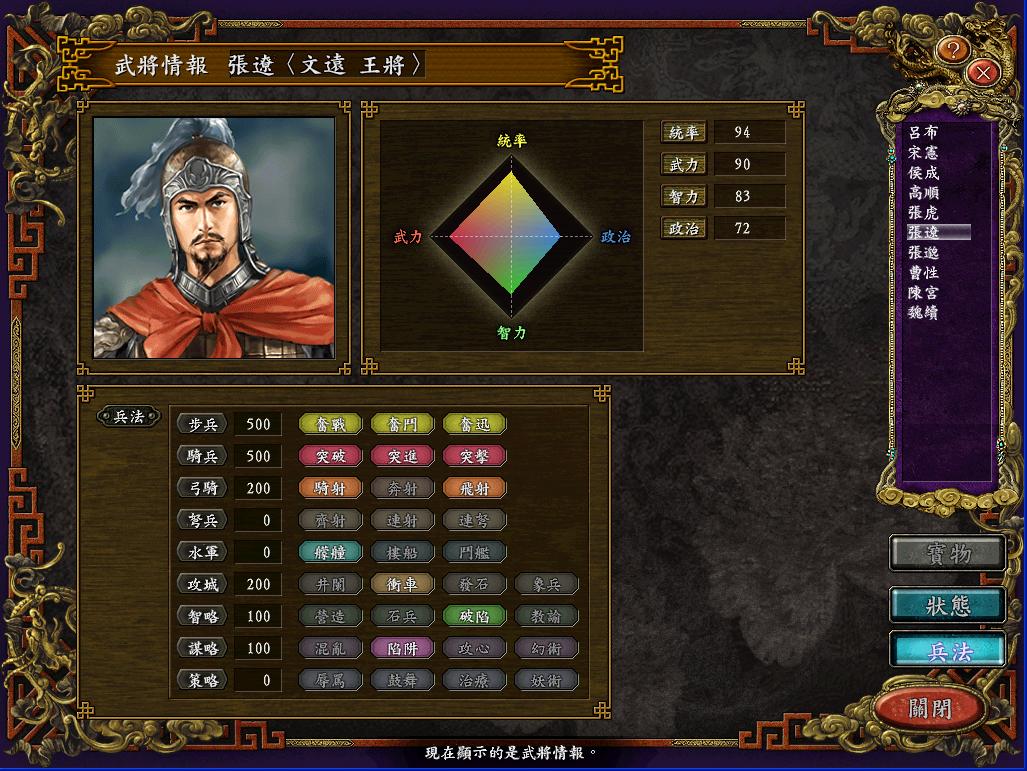 张辽是秦军会兵法最多的武将,加上飞射一共12个兵法。500的奋迅和突击威力极大,在之后的战报中,张辽前期和吕布组飞射队或者突击队,中期和陈宫还有几个小兵组突击陷阱队,后期把一个小兵换成儿子张虎组队,联动性也非常好。他的破陷兵法在邺城之战立下了汗马功劳。90的武力挑二流武将没问题,挑张郃之类的一流武将中武力较低的问题也不大,不过中前期培养出两个武力100的小兵后基本上就不用张辽单挑了;94的统率也是属于超一流水平的,更可贵的是83的智力,这在吕布军中仅次于陈宫。在名将补丁中,张辽有无双称号“王将”,防伪报,搅乱,兵法威力1.1,在中后期作为一军大将还是很值得信任的。张辽带出的小兵是非常强悍的,会的兵法很多。