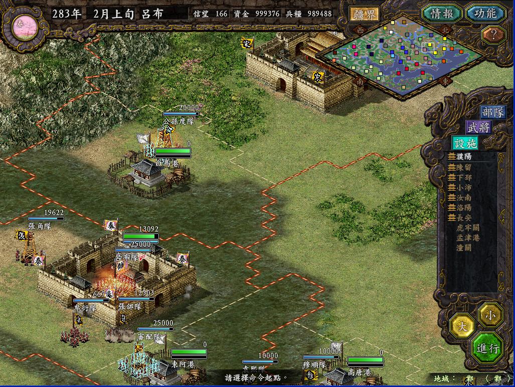 挡住了曹军的进攻后,秦军将安定的10W新兵全部运往长安,宛城;将上党的86K中的7W,晋阳的4W全部运往蓟和北平。这时发生了一件非常好笑的事情,襄平袁绍在柳城建阵想攻击偶的北平,而乌丸也出兵2W来攻打北平,结果半路上两家自己打起来了,死伤惨重。这时袁绍再次从平原出兵攻打濮阳,被偶轻松剿灭。袁绍从平原的进攻很麻烦,通常都要抽调很多人去迎敌,于是派魏续等人率3W兵马占领高唐港,这样袁绍就无法再骚扰濮阳了。曹军的许昌4面被我军包围,于是派遣吕布领35000兵马去攻打。这次攻城非常的失策,我没想到曹军居然出了三个文官陷阱团出来打我,以致中了3次陷阱,不过幸亏抢在敌军援军进城前攻下了许昌(其实敌军一共5w,出来3W5K,里面的1W5K被偶4个飞射解决,出来的文官团还没来得及进去,HOHO)。而南皮经常出兵攻打北平,于是派严政这个超级废柴带了3000兵马诱敌,把南皮主力引出城外,一直引到蓟附近,然后北平飞射队,蓟突击队同时出击,南皮只有1W人在防守,被偶轻松攻下。出城的敌军居然是锋矢阵,防守巨差,被偶几个突击全歼。由于俘虏到了夏侯惇等几个强人,于是把严政张勋张卫郑冲给流放了。