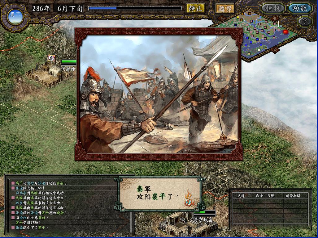 正当偶忙着征兵的时候,马腾和刘焉已经打的不可开交了。先是马腾带了4W人去打阳平关,结果被刘焉打了回去,刘焉顺势将屯了21W兵的汉中人马倾巢出动(留了4W),去攻打马腾8W人的天水,结果自然是马腾败北,而此时天水耐久只有100多,于是,我又用对付乌丸的方法对付刘焉,被偶白赚7W的生力军。为了南征,西北的马腾和羌军是必须清除的后患。于是吕布,张虎各领一军攻打西平。而武威的援军立刻出动,武威空虚,无奈安定离武威差不多1个半月的路还是让偶打消了奇袭的念头。而西平城下,两军陷入了苦战,马家军的突击,秦军的飞射都威力无穷,张虎队兵少,一番恶战后只剩4K人了。此时偶突然心生一计:令张虎奇袭武威,若西平不增援,则武威可得;若西平增援,则西平可得。于是西平到手。要问秦军如何取下武威,且听下回分解