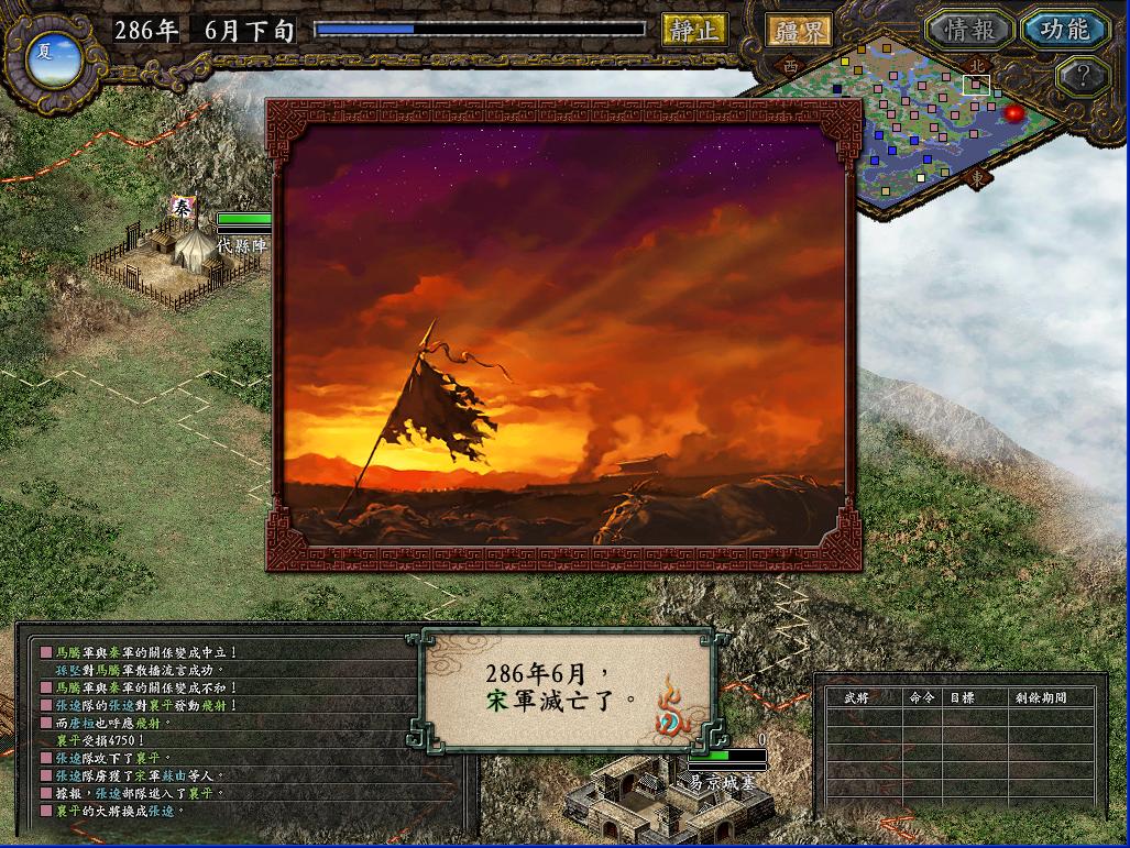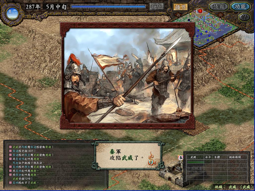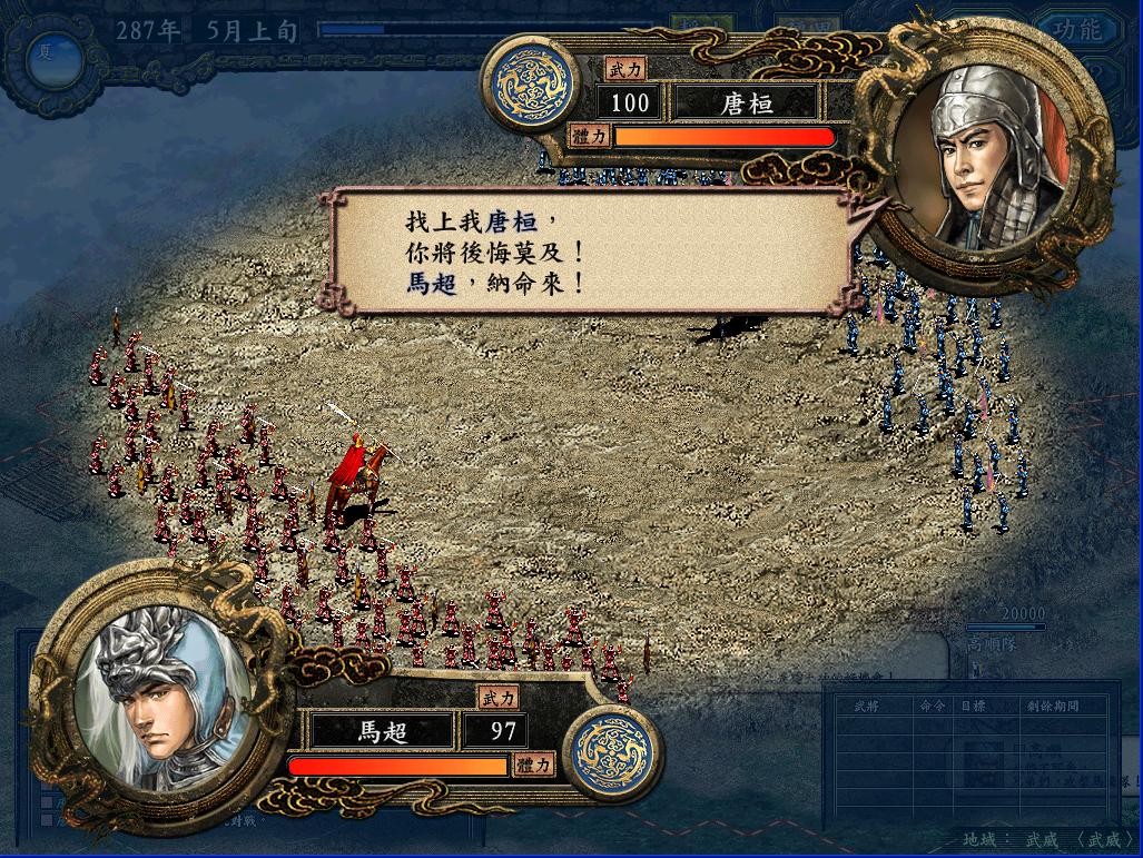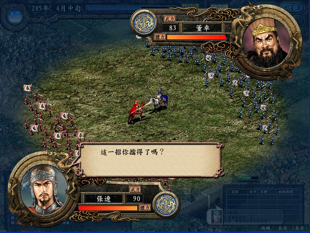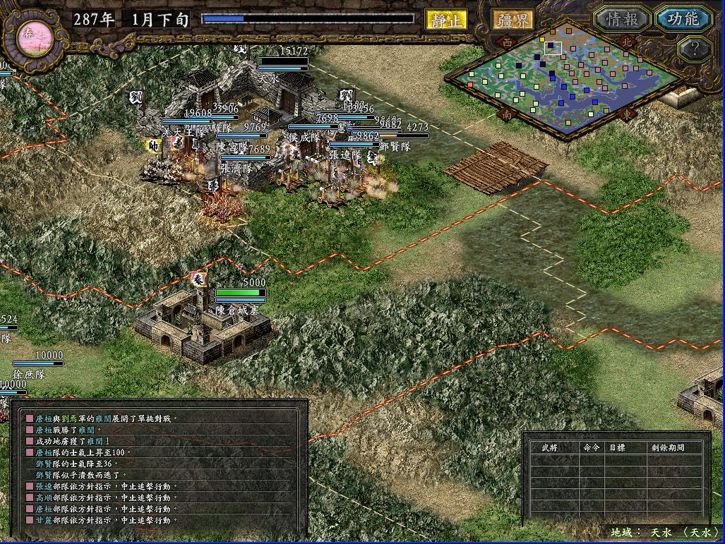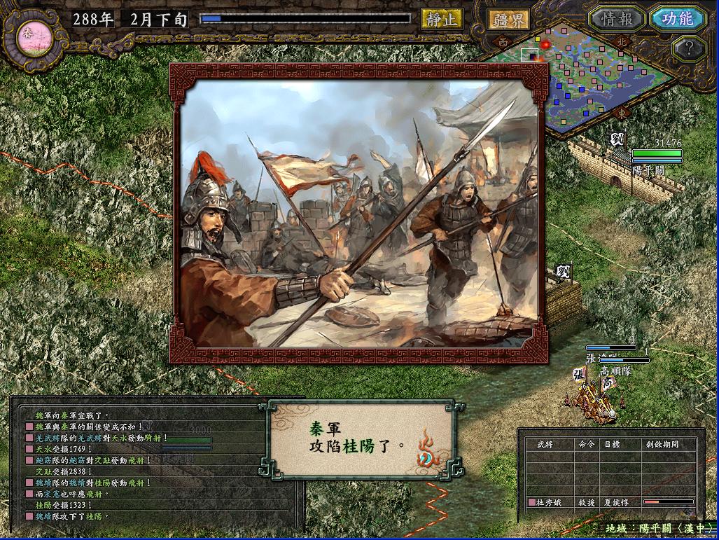 那个长安之战当时玩的时候,总是不由自主的想起汉中剧本那种三面夹攻的情景,如果敌军同时攻打我两个城,我就根本没办法从周围地方送援军过去(人手不够,守城都勉强凑合),而且守城的时候一个城最多留下7个将(两个城都在打,如果每个城8个将以上的话,另一边就没法守了),这样7个人还要有一个守城,6个人最多出两队,对付人家8,9队乃至十几队的攻城部队,实在是不好打。