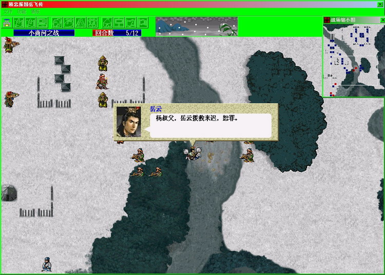 5. 经历毫无威胁的敌军第二回合攻击后,第三回合汤和张就能彻底逃出敌军的层层包围,mission complete;如果你想汤和张就此逃脱的话,那只要让汤怀和岳飞或牛皋对话即可,随后汤和张先行撤离战场,胜利条件变更为“坚持到第12回合”,不过因为已经逃出生天,外加增援部队也已抵达,汤和张可以继续投入到自卫反击战中,直到12回合再进行对话,其中要优先消灭金兀术,因为他会主动找汤怀单挑