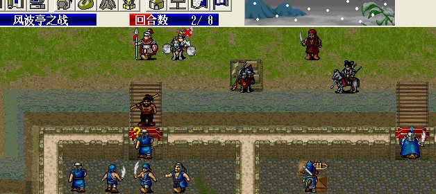 第二回合张保砍杨bt(以后每个回合张都要砍杨bt直至砍死它,不能停,否则他的能力随回合变强,后面不再重复),血要足够防得住他的反击(我的湛卢+80,杨bt血686,不考虑剑的升级理论值砍9次,拳师566,则要8次反击)欧阳还能挺一次风策略就给张保吃佳肴,主力三人组往左走至左数第2,3,4格,确保避开杨bt的风策略(岳飞要在左数第四格,即三人组中最右的一个),岳飞吃山泉补点magic等下用,王横补一精粮,李琴移到民居处,给自己加攻吧,银瓶移动到民居右下格,这样敌军回合中门弓兵就不会冲出来。敌军回合杨bt狂风大作攻欧阳,拳师继续打张保,这次张已经不是很怕双击或爆击了,弓骑射王横,确保不死便可。