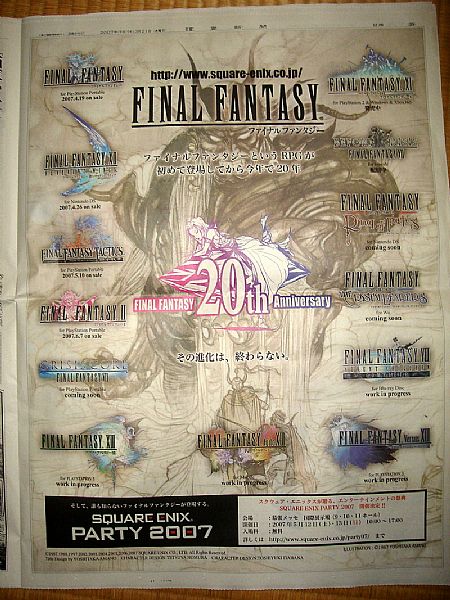 Square Enix在3月21日的日本报纸《读卖新闻》中用一个整版刊载了《最终幻想》系列作品20周年纪念的消息。其中还特别标明了在“SQUARE ENIX PARTY 2007”活动中将有一款“谁也不知道的《最终幻想》”揭晓,这预示着在“SQUARE ENIX PARTY 2007”中将会有《最终幻想》系列新作发表。