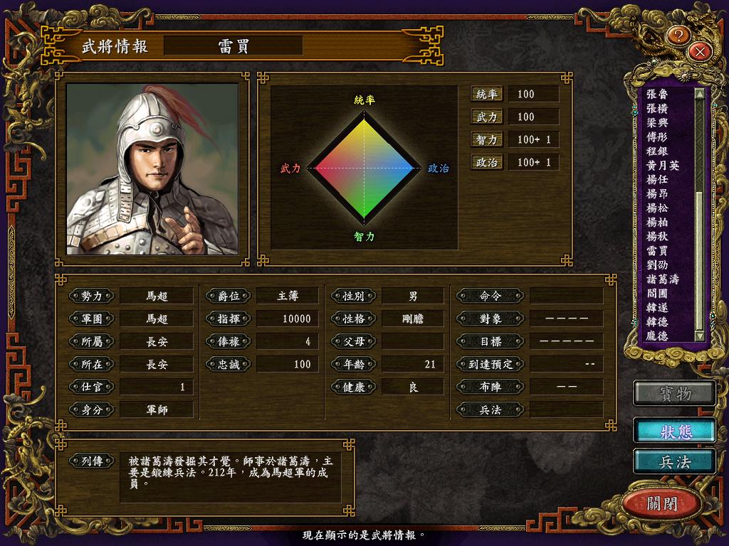 武力和统率都是100,智力79,政治45,名字叫孟喜。大概是孟获的长辈吧?