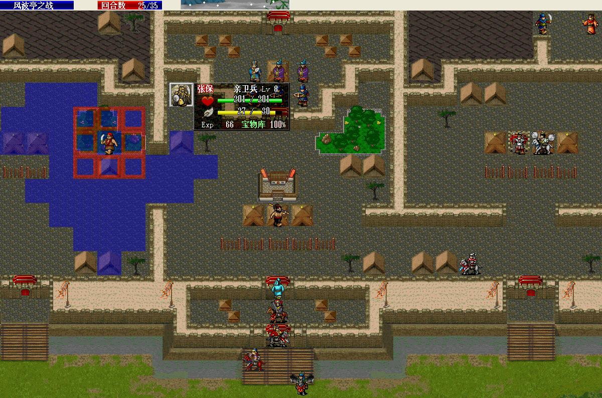 第3回合从右侧赶过来的李琴堵在中间御林军的前面桥头上,这样后面的弓骑无法出击,张保一侧需要读暴击将武术家反击死,否则在下一回合武术家会喘气而先行动,被张保反击死后杨沂中会过来攻击,张保小命也就没了;