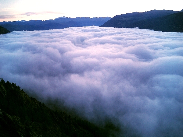 太阳出来了,瑰丽丰满的雾在山顶舞会跳完最后一曲,缓缓退下。退到半山腰,停住了。我们沿另一条路下山,又一次渐入雾中。而这一次,却是之前从未曾见、之后也未得见的最美景象。