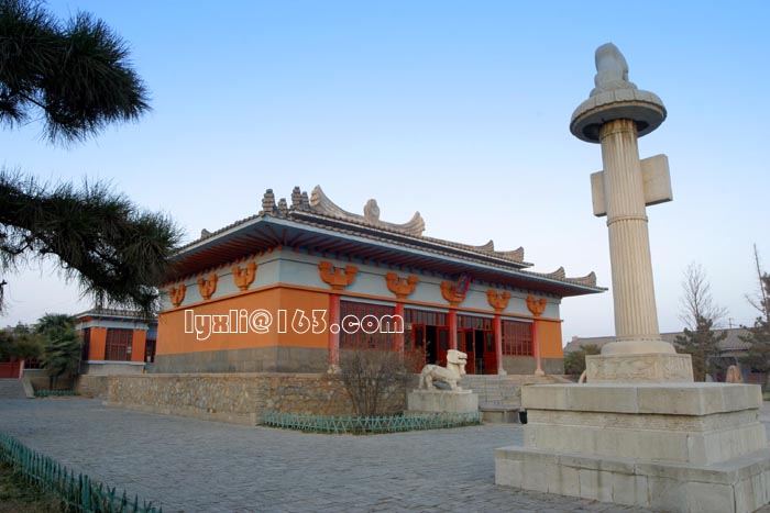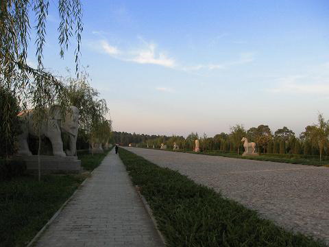 初来乍到,抬眼就是两根高大雄浑的看门柱,仿造的~汗——#,举步向前,左右两旁为林荫小道,中间为宽阔的鹅卵长甬(真的很长)--这是外陵到陵园门口之间长长的神道,道两侧立有石像石人石马,那是古代帝王陵享有的待遇(鼓掌~~~),顶着烈日我与朋友步行至景区入口(汗出如浆,忘带伞了)。