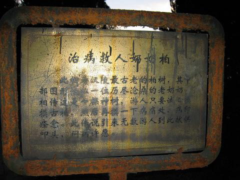 奶奶柏,传说是刘秀为纪念在他落难之时用一口粥救活他的一位老妇人所栽,很粗很壮,摸摸长不胖(笑