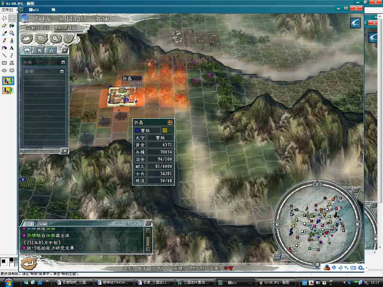 下面是一个关键,四支点火部队进入许昌後,许靖一定要退出许昌境,这样电脑不会再出兵,就向新野方向跑吧,顺道把新野拿下。