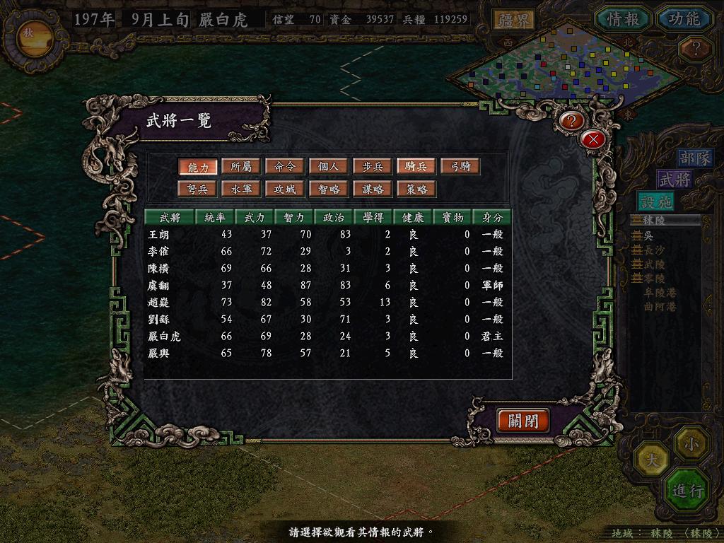 剧本是194年史实模式,无人造武将,无修改数值,这个时期严白虎应该是诸侯中最弱的一个了吧,哥俩政治力绑在一块儿还不够50,伪报扰乱几乎必中,任什么屁人都招不来,想存活下来只有一条路可走,赶紧找房搬家。好在这会荆南四郡乃是空城,赶紧征兵训练。到8、9月的时候,带上一两万人西巡,先打桂阳,再克零陵,然后是交趾,过了年就可以当交州州牧,再给傻兄弟封个将军干干。然后把武陵长沙也占了,等着吃钱粮。玩严氏其实日子过得飞快,每旬看都不看,就干两件事,征兵再训练。不过要注意军粮,我的经验是把兵马控制在5W左右就应该没问题,如果有商人来了,不论粮价去买吧,毕竟行军打仗兵粮很重要。接下来就只有耐心等待了,等待戈多?不是。等待山越大王去打会稽,机会来了,带着兵马跑回吴。待山越人把城快打烂了的时候,赶紧出兵。严白虎排鱼鳞,严與开冲车,不要直接去打会稽城,走不到就被伪回来了。攻击目的选择山越,等走到会稽城下时改变方针,电脑通常会出兵野战,最好在出兵时不要把武将排在锋位,因为挑衅是必中的,万一被砍伤,就不可能成功了。打仗之前可以存个档,实在不行就S/L,因为这两位大爷的行动实在是难以预料,经常无视方针擅自行动。虽然两队人马有45000人,但真打起来是抗不住几轮兵法的,所以每回合都要调整方针,主要战略就是用25000人的严白虎缠住对方武将,掩护严與的20000冲车部队,我打到最后,严與把城撞到30几城防度就被消灭了,最后是靠严白虎的几千人一点点把城给蹭下来的。