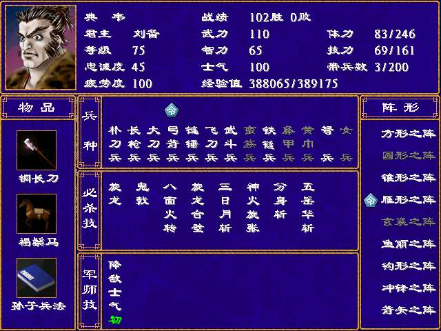 我还是下不了毒手啊!我不败的将有十多个啦!最高才14胜,还是关羽呢!程昱、简雍、刘备、张飞、周仓等都没有败绩啊!猛将没有找到啊!我没有用太多的S/L大法啊!
