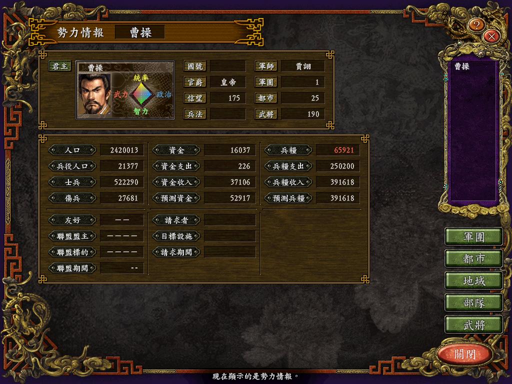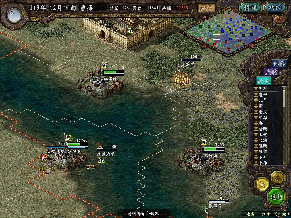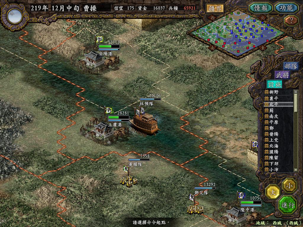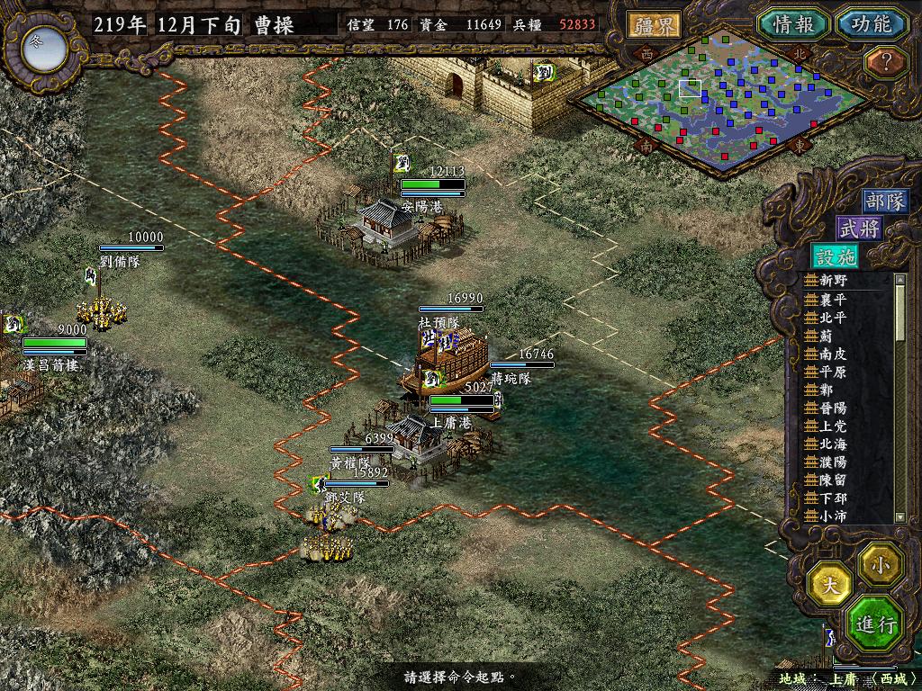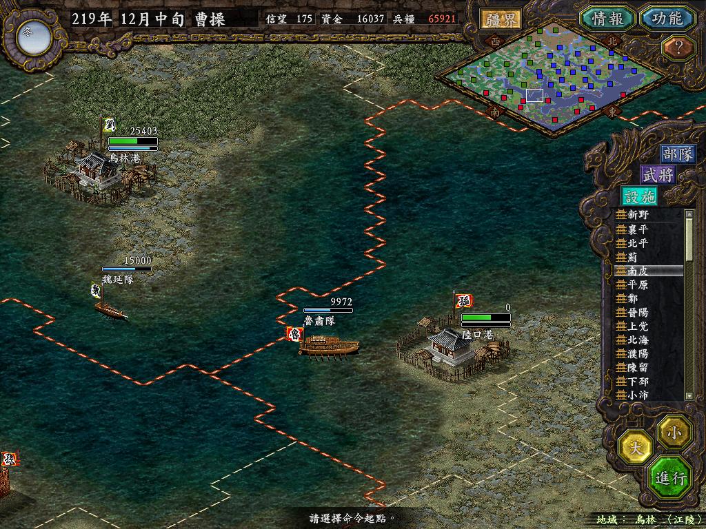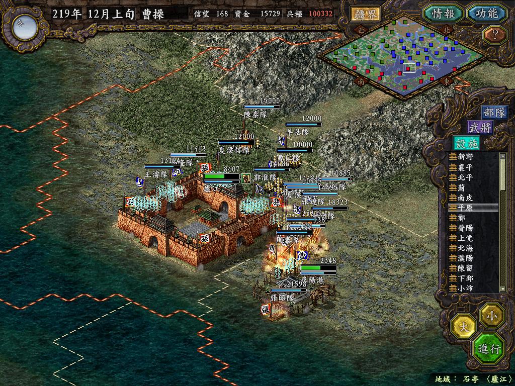 进行面:第二天曹彰就夺取寻阳,吴国各部除孙策由西门杀出,6W2皆呆于城内.夏侯霸部一马当先,发动连锁奔射,公谨损失1300人,剩余300兵马仓皇南逃,郭淮轻骑终于赶上,王双于阵中冲出,当下擒住公谨,三尖刀一闪,公谨重伤落马,徐盛见状,回马来救,拖回主帅,吴兵围上,策见状,大呼:公谨无恙呼!一个奋迅,杀的左翼的王睿人仰马翻.公谨只剩半口气,呻吟曰:既生瑜,何生双!夏侯部的夏侯惠见兄立大功,不甘示弱,文有文用,一个混乱定主公谨,吼道:复呻吟乎?自此瑜部全灭,徐盛为救公谨被俘.策的5000步兵也杀的只剩300人.