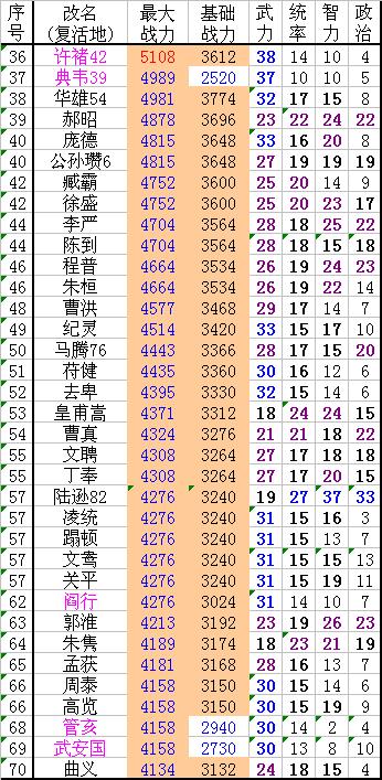 武力属性、统帅属性基本保持40、30的上限,战力上限根据美女略为增加。吕布、关羽加上美女不用最高训练则9999战力。
