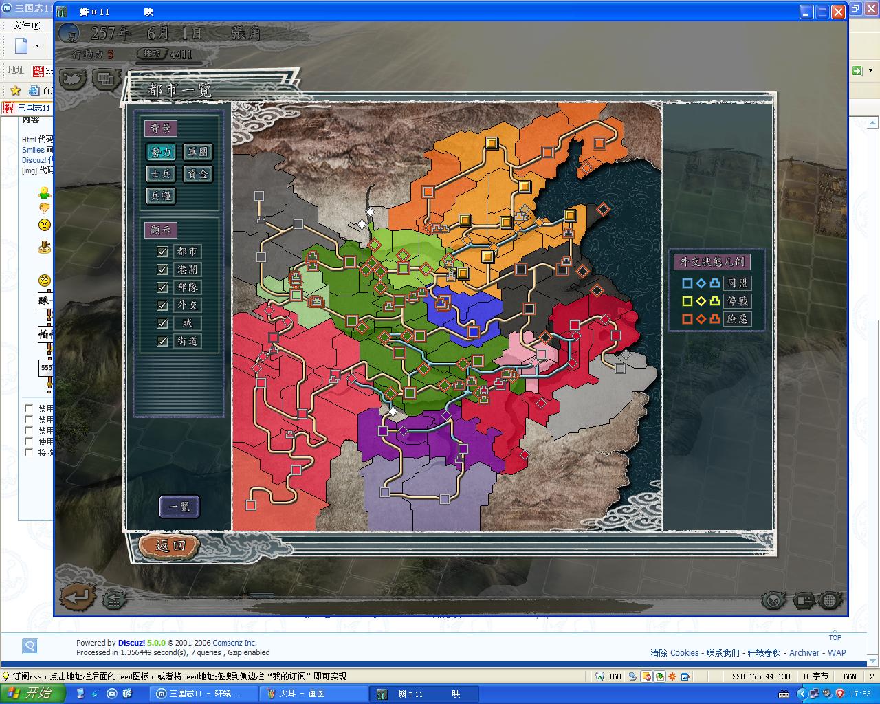 251剧本。我玩张角,被吕布压的有点死。发展很慢。。大耳拿了3个空城市跟吕布联盟。死蚂蚁被曹操和大耳朵压制的找何进同盟。司马懿兵分2路 一路我的陈留一路曹操的老家。大耳朵竟然直接杀进长安。把皇帝废了。。真卑鄙 还皇叔呢。。。