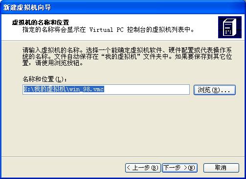 输入新建的虚拟机的名称,点浏览可以指定虚拟机文件的存放位置,如果不指定,默认是存放在我的文档\我的虚拟机\下面.