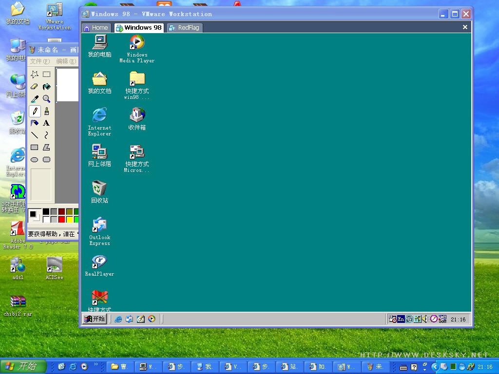 也许到了这里,你会认为我用的是多系统,就是在一台电脑上同时安装几个系统,要用win98的时候,在启动的时候选择win98,而要用XP的时候,要重新启动,再选择XP,那我可以对你说,你错了,我的系统是不需要重启的,我五个系统是可以同时存在的.不要说我在吹,我是真的做到了.