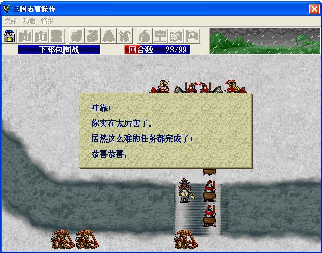 以前从来没有达成条件,得到战神徽章,什么堵北门,堵南门的,这些方法根本不好使嘛,你再怎么堵城里面有兵偷袭你,你还混乱,降低攻击,防御什么的.自从知道了东门大逃亡后,今天试验一下,要不是撤退时候小小的失误我就直接一个人不死了,把张菁挂了,其他人全活下来了,发现吸引火力很重要啊,我的张辽在那里基本成了个盲点,吕布把火力全吸引走了.贾诩放大火,那个图不对,应该是烧火图,怎么是减敏捷图啊?幸好存档了,有一回合直接烧死好几个.第17回合,城里的兵早没了,我把人全围着吕布放了一圈,呼啦一下又出一大群,幸亏都是小角色,我陈宫也防住了......哈哈,高兴啊