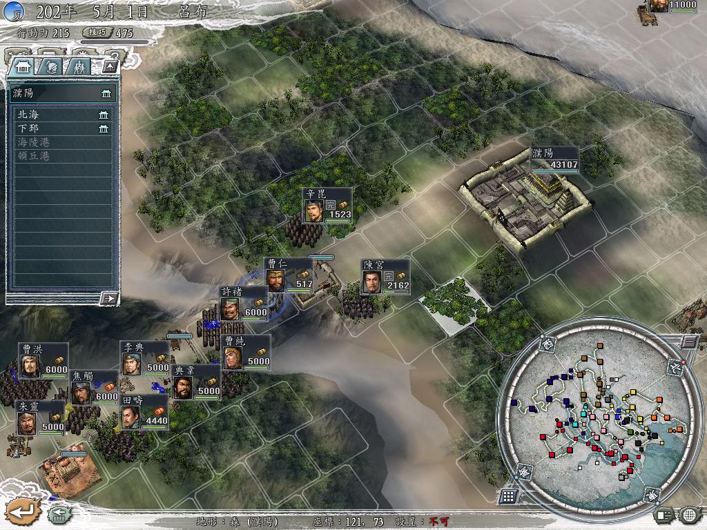 曹操打到还有7000人的时候就不出人。我就派了4队人去他家埋火球。但是他的虚实太牛X了。6月1开局的。11月11人灭了刘备之后。到3分月才灭了灭了曹操。灭了他之后一队人带这不到3千人直达洛阳。过了虎牢关之后竟然没有粮食了。进城之后刚刚好转月、粮食有了。但是却出贼了。郁闷。袁术当皇帝了。。不来打我了。陶谦却来了。我准备放弃小沛了。长安也来了。40几个人。工资都可能发不出来啊。穷。然后我放弃了小沛。洛阳和长安进攻成功。现在在曹操在长安放混乱。陈留也在防守。2路进攻重点是邺和宛。