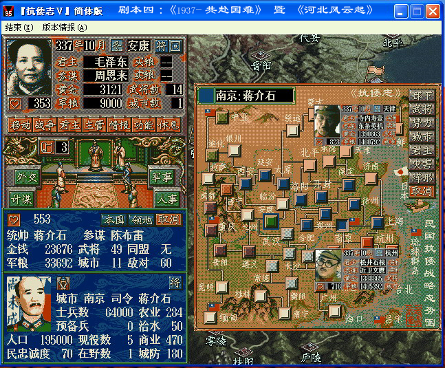 游戏一开局,日寇华北的寺内和华中的松井阵营自动结盟60个月,而所有中国的势力也自动结盟1个月组成“抗日民族统一战线”。玩家扮演中国统帅,在北最好据守西安、拉萨,扼银川、迪化及中亚一线,策应延安、临汾、西宁、成都,以西北大后方抗击日寇。在南则最好据守重庆,扼守昆明、缅甸,策应成都、贵阳,拱卫西南大后方坚持抗战。其他城市可能很难挡住日寇进攻。此外统帅参战一定要谨慎,避免被日军俘虏,因为日寇非常残暴,抓住中国势力统帅砍头的几率很大。