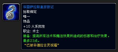 装备后效果:在成功施放法术后有2%几率可以触发100%魔法恢复的效果,持续15秒。