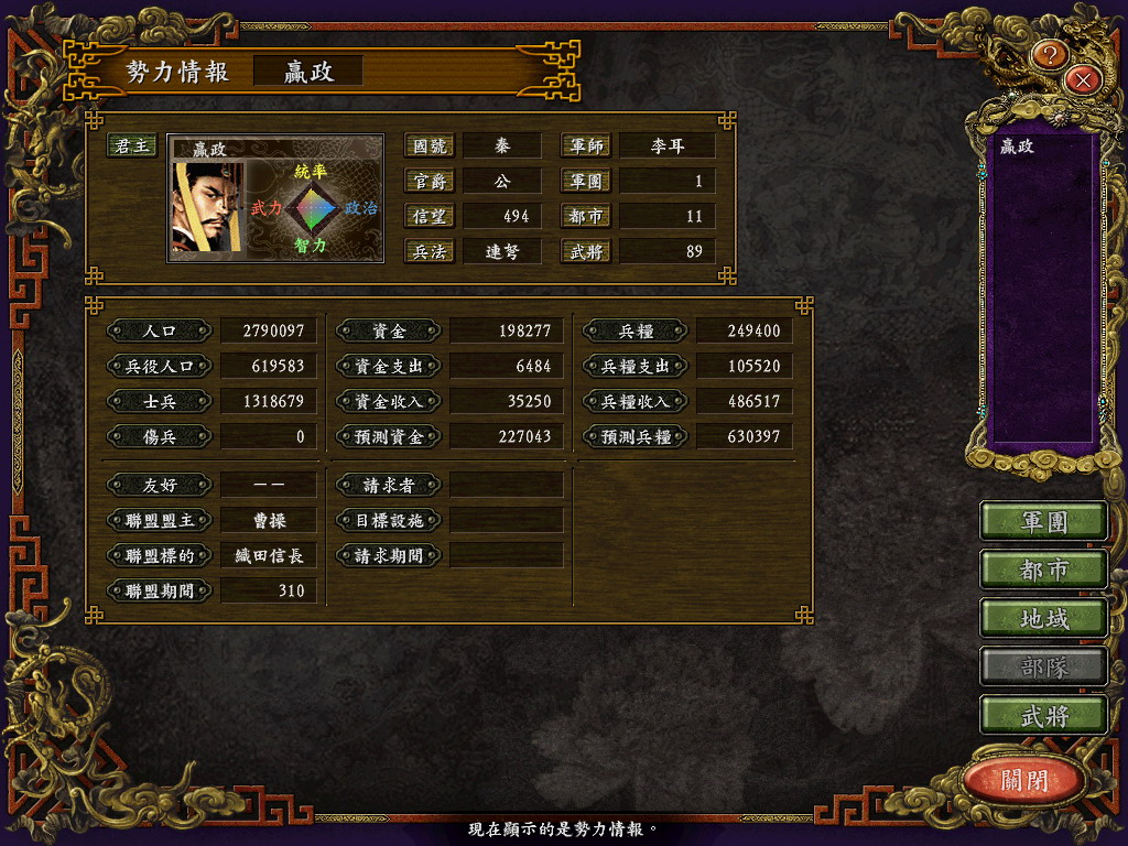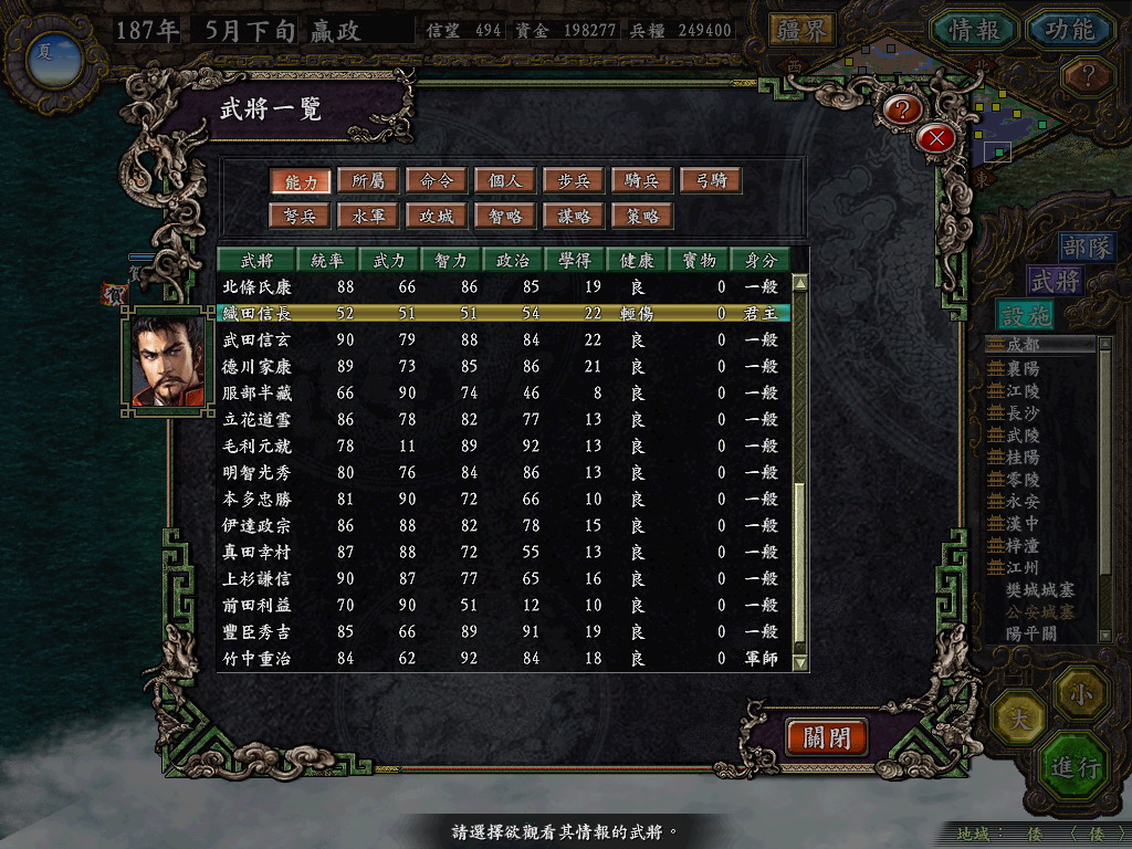 简单说下这个剧本,就是新建立了100个新武将,还有把一些不常用的人换成了一些日本战国武将,加如了甄女王,除日本武将外全部补完列传,新假如若干宝物,比如赵云的龙胆枪,把一些不常用的宝物图片换了。电脑可以攻打异民族,异民族也能占领城池了,更改了异民族武将的名字和头像,做到了一人一名字头像,列传没法改,光荣把4个相同名字的异民族武将都用的同一个列传文件。 新加如秦势力,君主赢正,武将88个中国古代武将。用孟获取代原南蛮势力。新假如函谷关,改了些地名。具体看图。花了我很多心思。