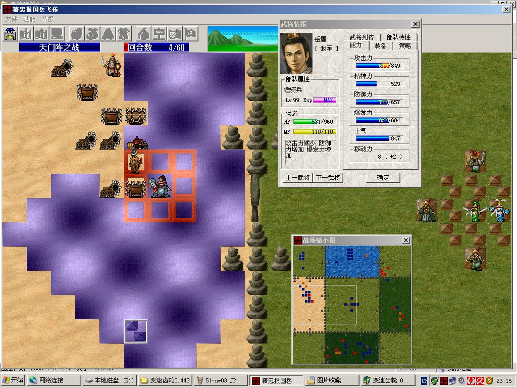 在进入正题之前,先汇总一下这关之前各人的能力加成情况。诸葛锦除了继承诸葛英的能力之外,精神和统御另外再加20点;在金龙阵我刷了岳云爆发力增加50点;杨继周继承杨再兴能力之后攻击、敏捷再各加20点。不过问题是,小杨继承的是小商河结束时老杨降过防御后的能力,即使小商河上第一时间让老杨挂掉,小杨的防御力还是会比正常值低30!