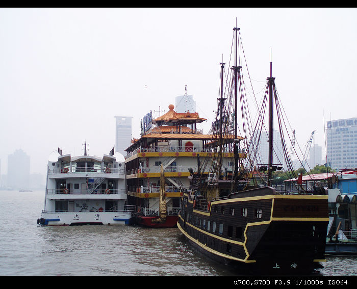 偶坐的是票价50元一人的游轮,从外滩出发,绕一大圈靠岸。上岸时,不经意瞥到一艘西欧古典风格的三桅小船。在古代与现代游轮前,颇为有趣。