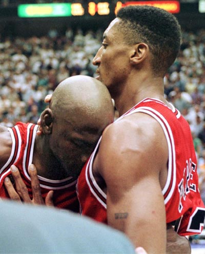 1998年5月13日,乔丹率领公牛队在东部决赛中击败步行者队,连续第三年夺得东部冠军并杀入总决赛。图为当天公牛队获胜后乔丹与队友皮蓬庆祝胜利。