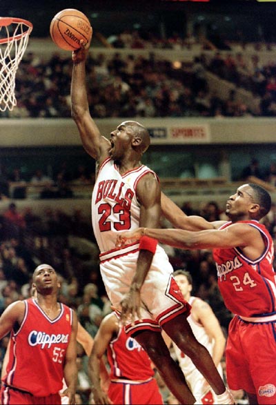 1996年10月29日乔丹被评为NBA历史上50大巨星之一。1996年11月30日乔丹在圣安东尼奥获得职业生涯的第25000分。图为1996年12月5日乔丹在公牛队击败快船队的比赛中。
