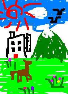 虽然是第一次用鼠标画画,但是凭借着月月多年的美术经验,月月这幅画还是比较成功的。画面由蓝天、白云、雪山、草地、骏马、飞鸟、野花、楼房等组成,体现了人与自然和谐共处的美好心愿,是绿色奥运精神的又一体现!