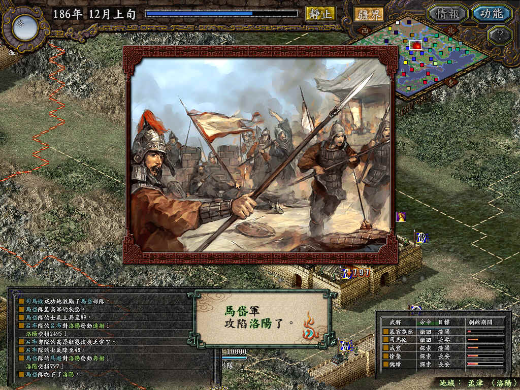由于吕布是出井栏队,就算不发动连射兵法,对只有一万余兵力的洛阳,还是很容易拿下的。