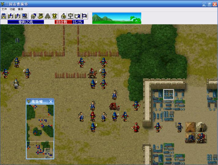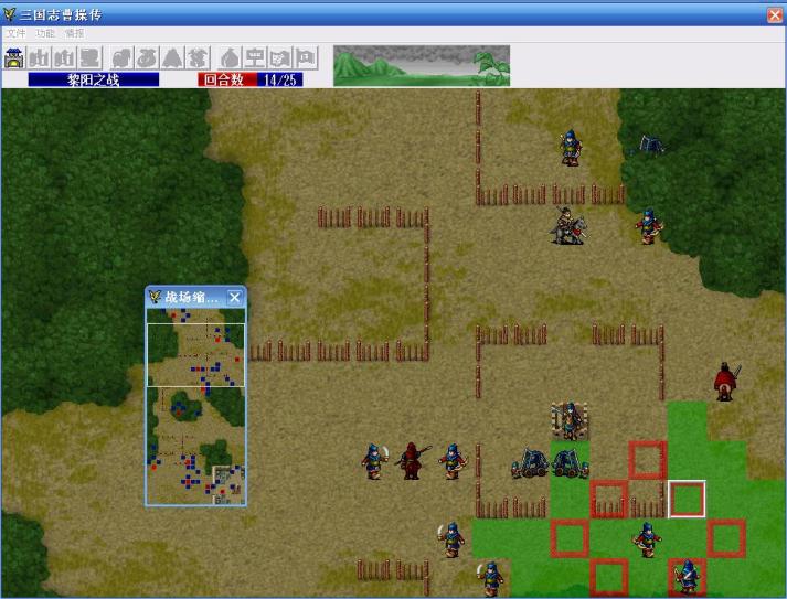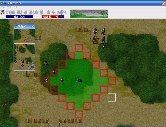 第一回合,典韦凭借爪黄之力,进入区域(0,0)-(19,28),也就是越过第一道栅栏,引发栅栏里的7名敌人主动出击,曹操引一个弓兵,不要让他挡典韦北上的路,张辽引那个步兵,曹仁往上走准备过栅栏,其他人往袁谭所在的城里走。
