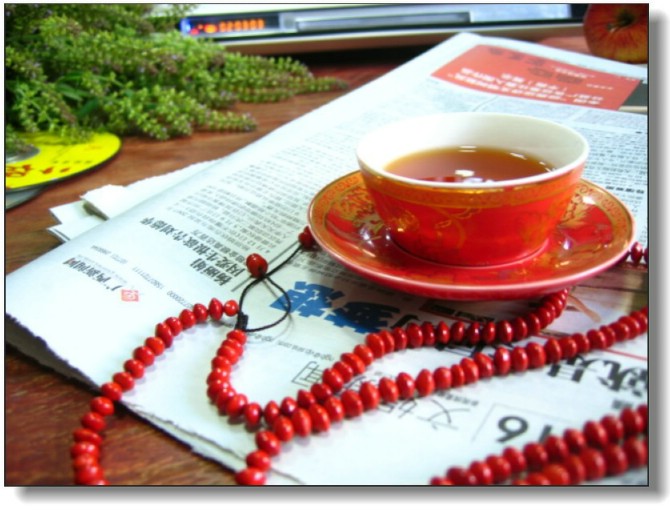 红茶配上红色茶具相得益彰,那串珠子让人有些想起了红麝串。