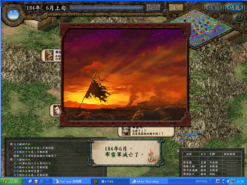 得了汝南之后很高兴,觉得换季之后就钱粮无忧了,于是读档把攻长安的部队撤回西城防守.原因是觉得本帖的标题是<挣扎在西城>,所以为了扣题还是尽量不想放弃老家,而长安虽然战略意义更重要,但以我的兵力打下来也得花2-3旬,而打下之后又得面对董卓军的胡遵队,队中先锋吕布,军师杨残废....