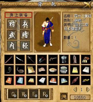 物品:假倚天剑,单刀,木棍,飞镖,火枪,软猬甲,乞丐服,武穆遗书,蛇胆,熊胆,九阴上下卷,