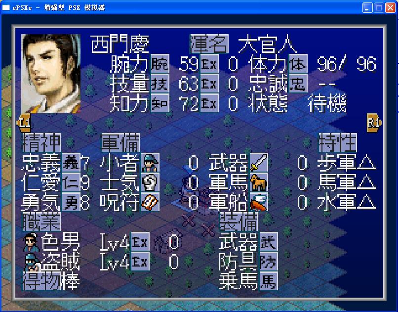 西門慶:腕/技/智 59/63/72 ;忠/仁/勇/体 79/91/88/96;全战斗适性:△/△/△ ,职业:色男