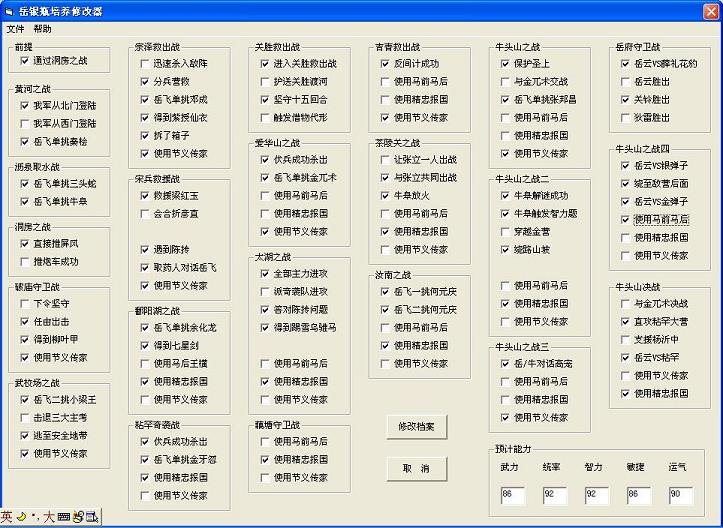 由于修改器的缺陷,统制的方案里,破庙时坚守与柳叶甲没有同时选。但实际上,柳叶甲必须获得。获得柳叶甲后,如果是坚守,那么最终5围就是56,90,100,100,100。如果是护送,那么最终5围就是48,94,98,100,100